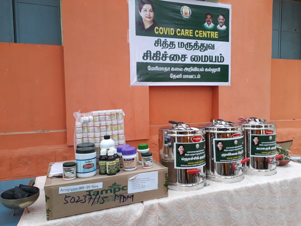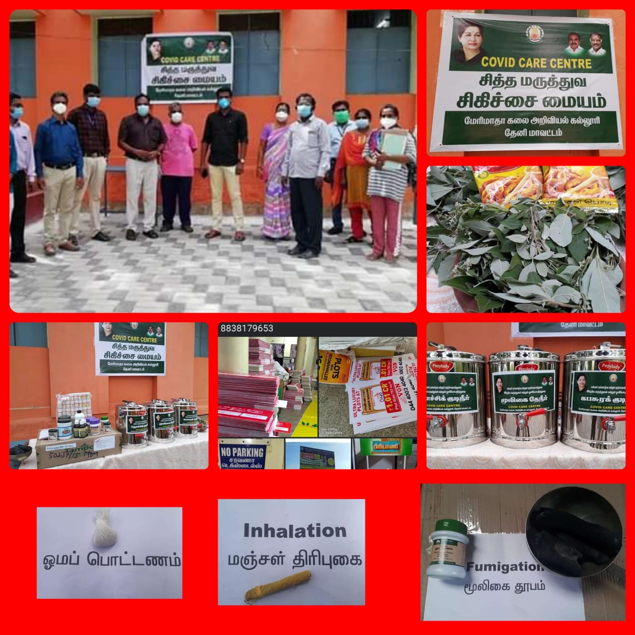 தேனி மாவட்டம் தேவதானப்பட்டி அருகே உள்ள தனியார் கலைக்கல்லூரியில் செயல்பட்டுவருகிறது கொரோனா சித்த மருத்துவ சிகிச்சை மையம். முழுக்க முழுக்க சித்த மருந்துகளை மட்டுமே கொடுக்கக்கூடிய இந்த சிகிச்சை மையத்தில், தற்போது 100 பேர் சிகிச்சை எடுத்துவருகின்றனர். தாளிசாதி சூரணம், கபசுரக் குடிநீர் போன்ற சித்த மருந்துகள் மட்டுமல்லாமல், உடலுக்கு ஆரோக்கியம் அளிக்கும், நம் பாரம்பர்ய உணவுகளையும் கொடுத்து அசத்தி வருகின்றனர்.