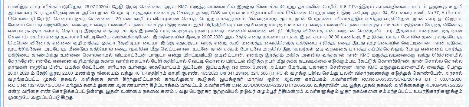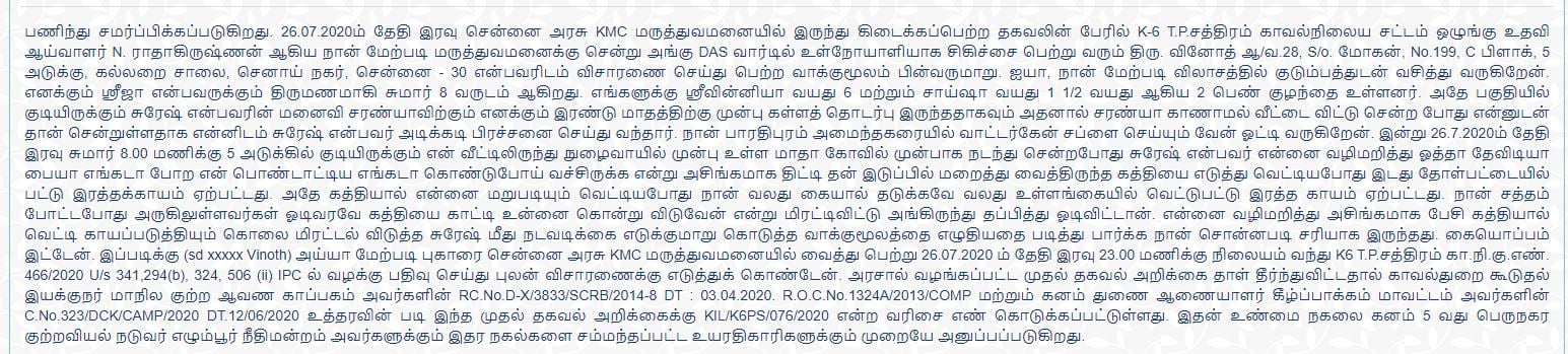 வினோத்தை, சுரேஷ் வெட்டியதாக வினோத் கீழ்ப்பாக்கம் அரசு மருத்துவமனையில் உள்நோயாளியாக அனுமதிக்கப்பட்டுள்ளார். அதனால் சப்-இன்ஸ்பெக்டர் ராதாகிருஷ்ணன் வினோத்திடமும் வாக்குமூலம் பெற்றிருக்கிறார். அதில், நான் செனாய் நகர் கல்லறை சாலையில் குடியிருந்து வருகிறேன். எனக்கு 8 ஆண்டுகளுக்கு முன் திருமணமாகி 2 குழந்தைகள் உள்ளனர். அதே பகுதியில் குடியிருக்கும் சுரேஷ் என்பவரின் மனைவி சரண்யாவுக்கும் எனக்கும் நட்பு ஏற்பட்டதாகவும், அதனால் சரண்யா வீட்டைவிட்டு வெளியில் சென்றதாகவும் சுரேஷ் கூறிவருகிறார். மேலும், சரண்யா என்னுடன்தான் சென்றுள்ளதாக சுரேஷ் என்பவர் அடிக்கடி தகராறு செய்து வந்தார்.