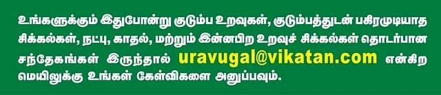 விகடனின் uravugal@vikatan.com என்ற மெயிலுக்கு வாசகர்கள் தங்களுடைய ரிலேஷன்ஷிப் தொடர்பான பிரச்னைகளை அனுப்பி வைத்து அதற்கான தீர்வுகளைக் கேட்பார்கள். அப்படி வந்த மெயில் ஒன்றுக்குத் தீர்வு சொல்கிறார் பாலியல் நிபுணர் மருத்துவர் டி.நாராயண ரெட்டி.