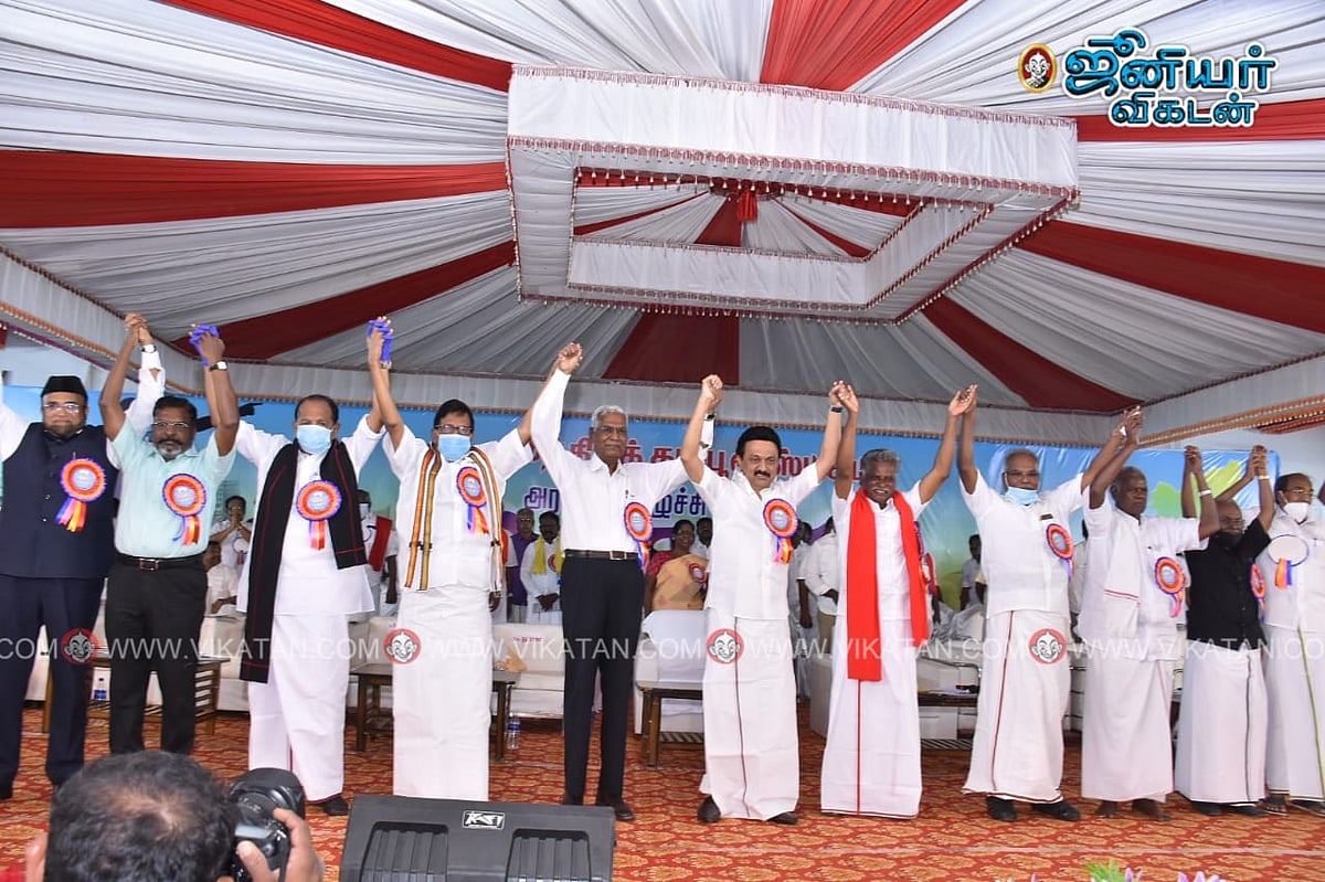 இந்திய கம்யூனிஸ்ட் கட்சி மதுரையில் நடத்திய அரசியல் எழுச்சி மாநாட்டில் மு.க.ஸ்டாலின் உட்பட கூட்டணிக் கட்சி தலைவர்கள் அனைவரும் கலந்துகொண்டனர்.