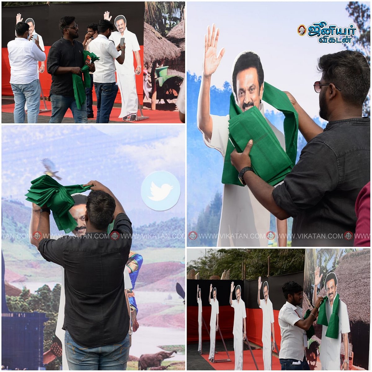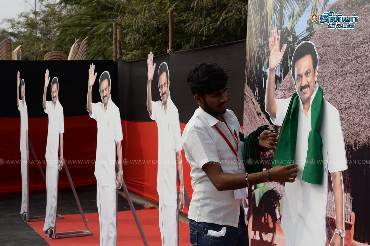 அதை ஊடகத்தினரும் போட்டோ எடுக்க, அவசர அவசரமாக வந்த ஐ-பேக் டீம், ஸ்டாலின் கட்அவுட்களுக்கு பச்சை துண்டு அணிவிக்கச் செய்தனர். ஆனால், ஓரத்தில் ஒரு ஸ்டாலின் கட்அவுட் தலையில் அடித்துக் கொள்வது போன்ற போஸில் சாய்ந்திருந்ததை, ஐ-பேக் டீமோ, தி.மு.க-வினரோ கண்டுகொள்ளவில்லை.
