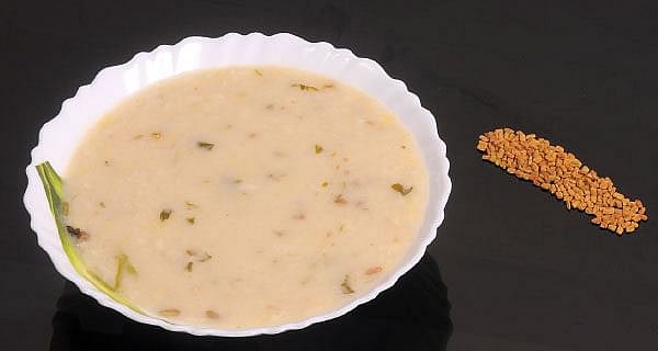 பச்சரிசி மற்றும் பாசிப்பருப்பு இரண்டையும் ஒரு மணி நேரம் ஊற விடவும். தேங்காயைத் துருவி பால் எடுத்து வைக்கவும். சோம்பு மற்றும் பூண்டுப்பல்லை ஒன்றிரண்டாகத் தட்டி வைக்கவும். அடுப்பில் குக்கரை வைத்து எண்ணெய் ஊற்றி சுடானதும், பட்டை சேர்த்துத் தாளித்து, பூண்டு, சோம்பு சேர்த்து வதக்கவும். இத்துடன் நறுக்கிய வெங்காயம், பச்சைமிளகாய் சேர்த்து நன்கு வதங்கியதும் கொத்தமல்லித்தழை, புதினா இலை, வெந்தயம் சேர்த்து வதக்கவும். ஒரு பங்கு அரிசிக்கு 6 பங்கு தண்ணீர் என்ற அளவில் அரிசி மற்றும் தண்ணீரை குக்கரில் சேர்க்கவும். இத்துடன் தேவையான அளவு உப்பு, பருப்புக் கலவையும் சேர்த்துக் கலக்கி குக்கரை மூடி பத்து விசில் வரும் வரை வேகவைத்து இறக்கவும். ஆறியதும் வெந்தய கஞ்சியை ஒரு கிண்ணத்தில் ஊற்றி தேங்காய்ப்பால் சேர்த்துக் கலக்கவும். பிறகு கொத்தமல்லித்தழை, புதினா இலைகள் தூவிப் பரிமாறவும்.
