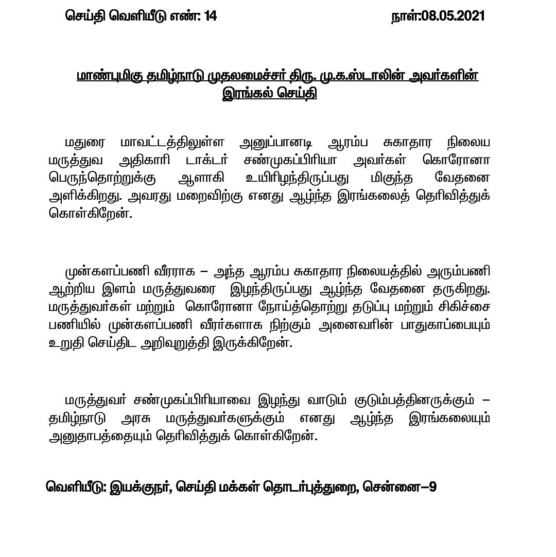 மருத்துவர் சண்முகப்பிரியா மறைவுக்கு முதலமைச்சர் மு.க.ஸ்டாலின் வேதனைத் தெரிவித்து அறிக்கை வெளியிட்டுள்ளார். பல்வேறு மருத்துவர் அமைப்புகள், சமூக அமைப்புகளும் இரங்கல் தெரிவித்துள்ளன.