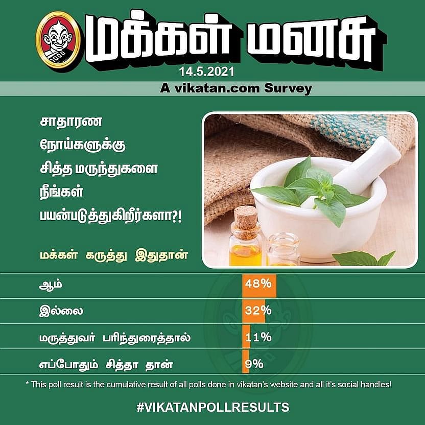 இந்தப் பின்னணியில், விகடன் ட்விட்டர் பக்கத்திலும் செய்தித் தளத்திலும் சித்த மருத்துவம் குறித்த கருத்துக் கணிப்பு (Poll) ஒன்றை நடத்தியிருந்தோம். அதில் “சாதாரண நோய்களுக்குச் சித்த மருந்துகளை நீங்கள் பயன்படுத்துகிறீர்களா?!” என்று வாசகர்களிடம் கேட்டிருந்தோம். ஆம், எப்போதும் சித்தா தான், மருத்துவர் பரிந்துரைத்தால், இல்லை என்ற நான்கு பதில்களைக் கொண்டிருந்த இந்தக் கேள்விக்கு மொத்தம் 4,500க்கும் மேற்பட்ட வாக்குகள் பதிவாகியிருந்தன.