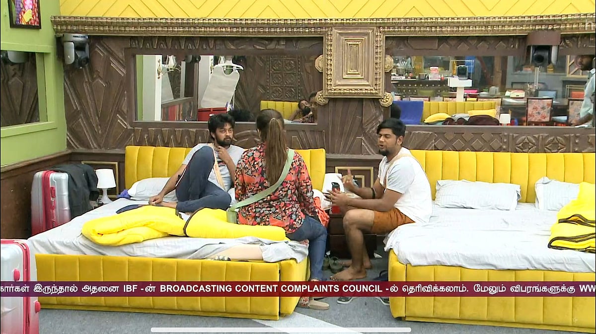 இசை வைத்திருந்த நாணயத்தை யாரோ சுட்டு விட்டார்கள் போலிருக்கிறது. ‘’பத்திரமா வெச்சுக்கோ” என்று சுருதி ஏற்கெனவே எச்சரித்திருந்தார். இசை இப்படியா வெள்ளந்தியாக இருப்பார்? “ண்ணா... எடுத்திருந்தா கொடுத்திருங்கண்ணா” என்று வளர்ந்து கெட்ட நிரூப்பிடம் பரிதாபமாகக் கெஞ்சிக் கொண்டிருந்தார் இசை. CCTV இல்லாத துணிக்கடையில் ஒரு ஆளையே மேலே ஏற்றி உயரத்தில் அமர்த்தி வைத்திருப்பதைப் போல, உயரத்தில் அமர்ந்து எல்லோரையும் கண்காணித்துக் கொண்டிருந்தார் அபினய். (ஹப்பாடா... நமக்கு ஒரு கேமரா மிச்சம்... இது பிக்பாஸ் டீமின் மைண்ட் வாய்ஸ்).
