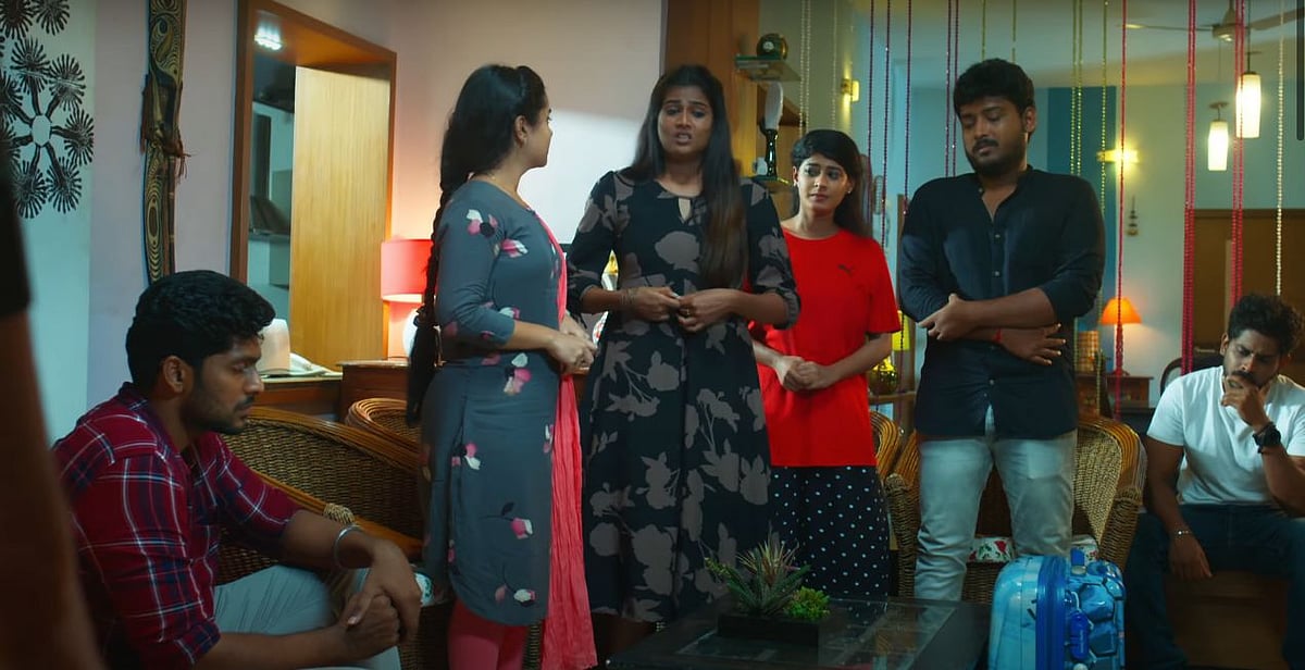 சுந்தர் பத்து நாட்கள் சென்னையில் தங்குவதாக சொன்னதும் மேற்கொண்டு வேறு பிரச்னைகள் வரக்கூடாது என வீட்டில் உள்ள ஆண்களை வெளியில் சென்று தங்குமாறு புனிதா, காயத்ரிக்காக கேட்டுக் கொள்கிறாள். ஆண்கள் மூவரும் தங்களது பெட்டியுடன் வெளியே கிளம்பி செல்கையில் வாசலில் சுந்தர் இருக்கிறான்.