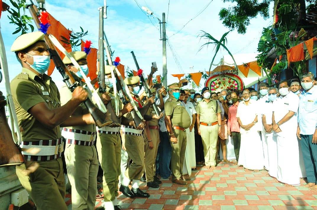 பத்மநாபபுரம் அரண்மனையில் சுவாமிகளுக்கு சல்யூட் அடித்து மரியாதை செலுத்தும் துப்பாக்கி ஏந்திய காவல்துறை அணிவகுப்பு.