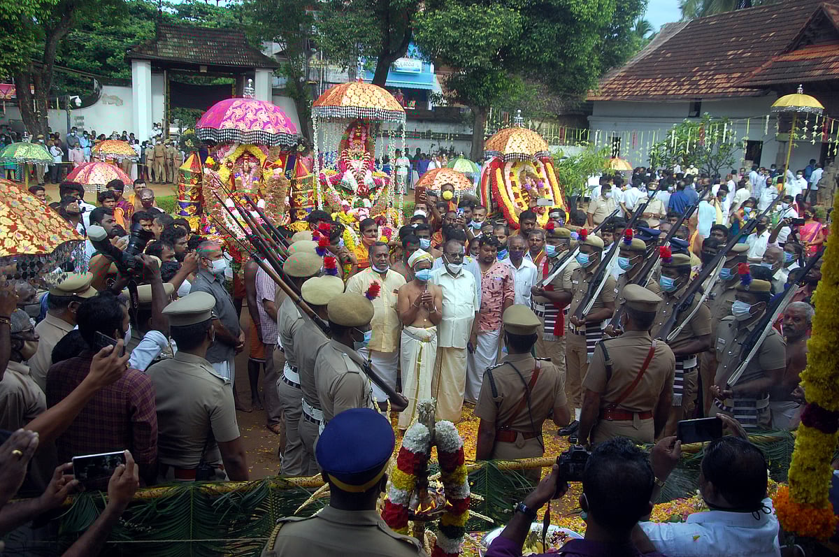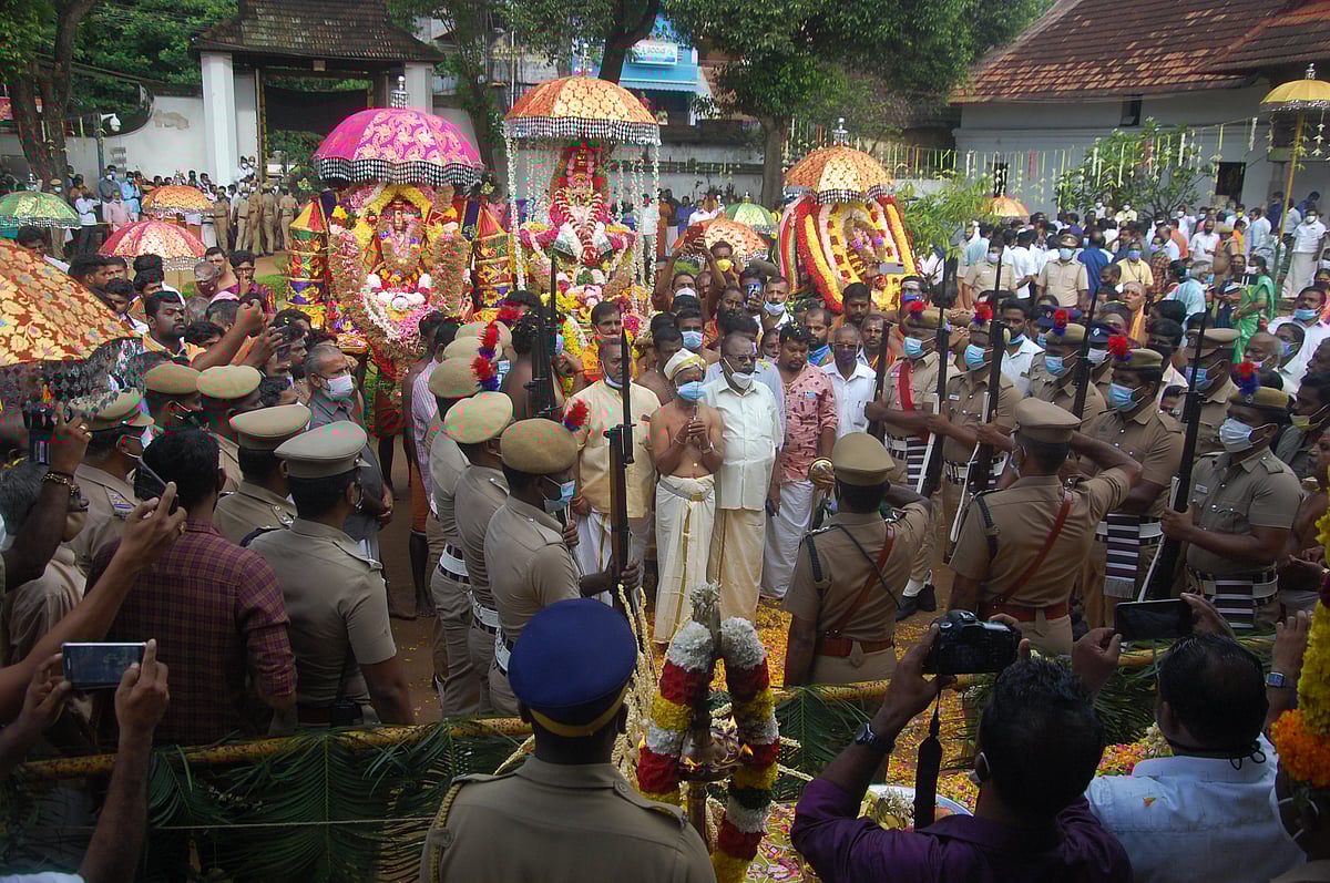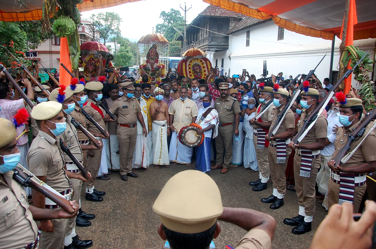 மன்னரின் உடைவாள் முன்னிலை வகிக்க துப்பாக்கி ஏந்திய காவல்துறை அணிவகுப்பு மரியாதையுடன் தொடங்கும் சுவாமி ஊர்வலம்.