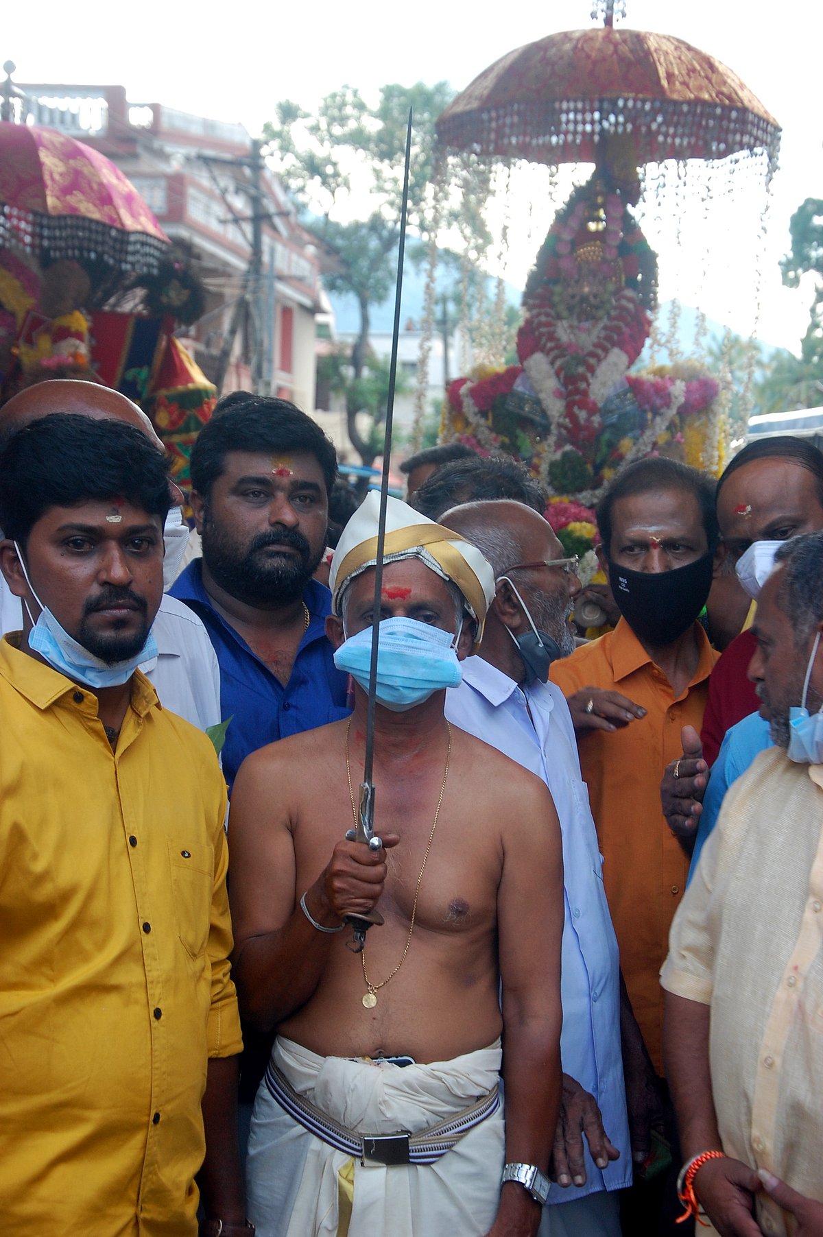 'மன்னரின் உடைவாள்' ஏந்தி வரும் அரண்மனை பக்தர்.