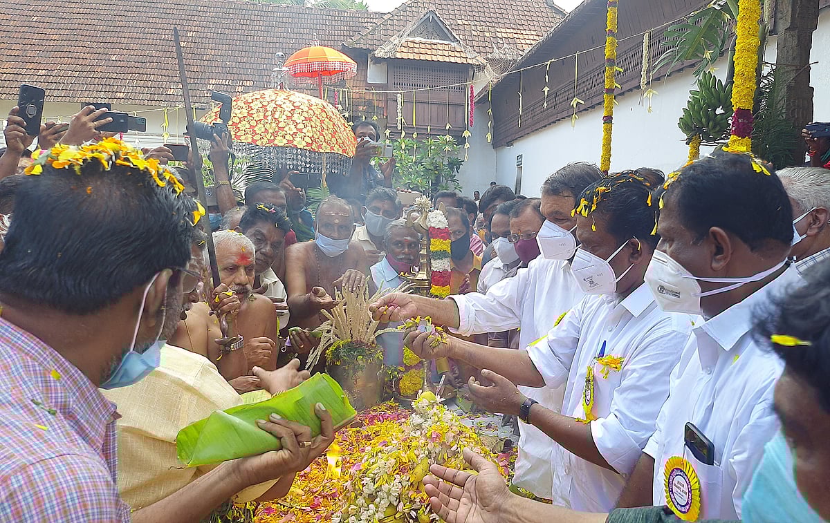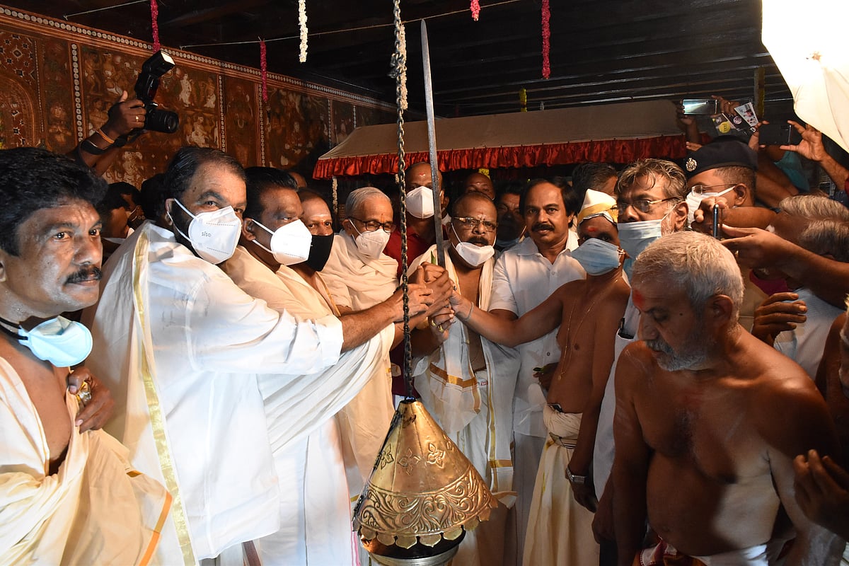 கேரள மாநிலம், திருவனந்தபுரத்துக்கு சுவாமி ஊர்வலத்தில் செல்லும் பக்தர்களுக்கு மன்னர் சார்பில் பிடிபணம் வழங்குதல்.