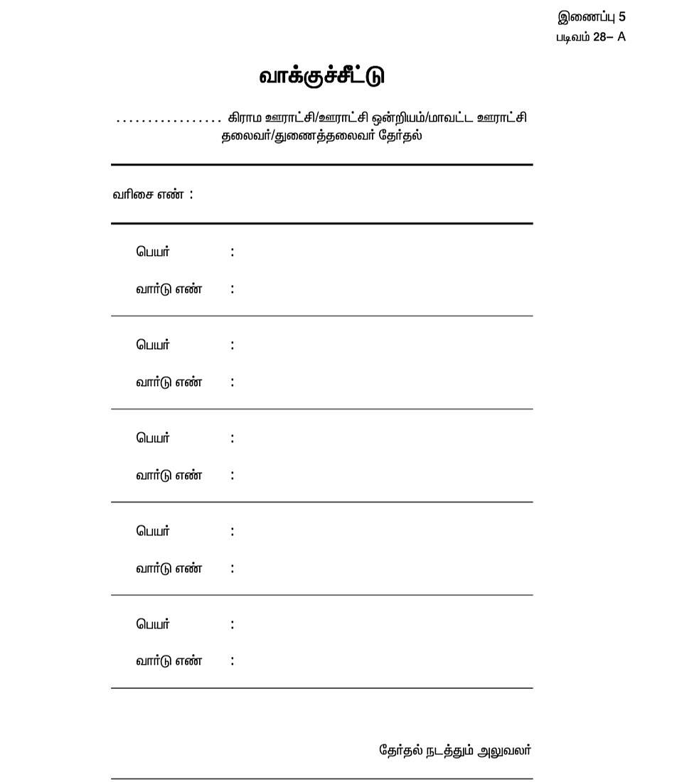 தலைவர், துணைத் தலைவர் தேர்தலில் போட்டியிட விரும்புவோருக்கு படிவம் 27 (ஏ) வழங்கப்படும். வேட்பாளர், அந்த படிவத்தில் சுய விபரம், போன்றவற்றை எழுதிவிட்டு உறுதிமொழி கையொப்பமிட வேண்டும். அதில், முன்மொழிவோர், வழிமொழிவோரின் கையொப்பமும் இடம் பெற வேண்டும். முதலில், மாவட்ட ஊராட்சித் தலைவர், ஊராட்சி ஒன்றியத் தலைவர், ஊராட்சி மன்றத் துணைத் தலைவர் பதவிகளுக்குத் தேர்தல் நடத்தப்படுகின்றன. எத்தனைப் பேர் போட்டியிடுகிறார்கள் எனத் தெரிந்துகொண்டு... அதற்கேற்ப வாக்குச்சீட்டு தயாரித்து உறுப்பினர்களுக்கு வழங்கப்படும். அதில், வேட்பாளரின் பெயர், வார்டு எண்ணை குறிப்பிட்டு, தேர்தல் நடத்தும் அலுவலர் கையொப்பமிடுவார்.