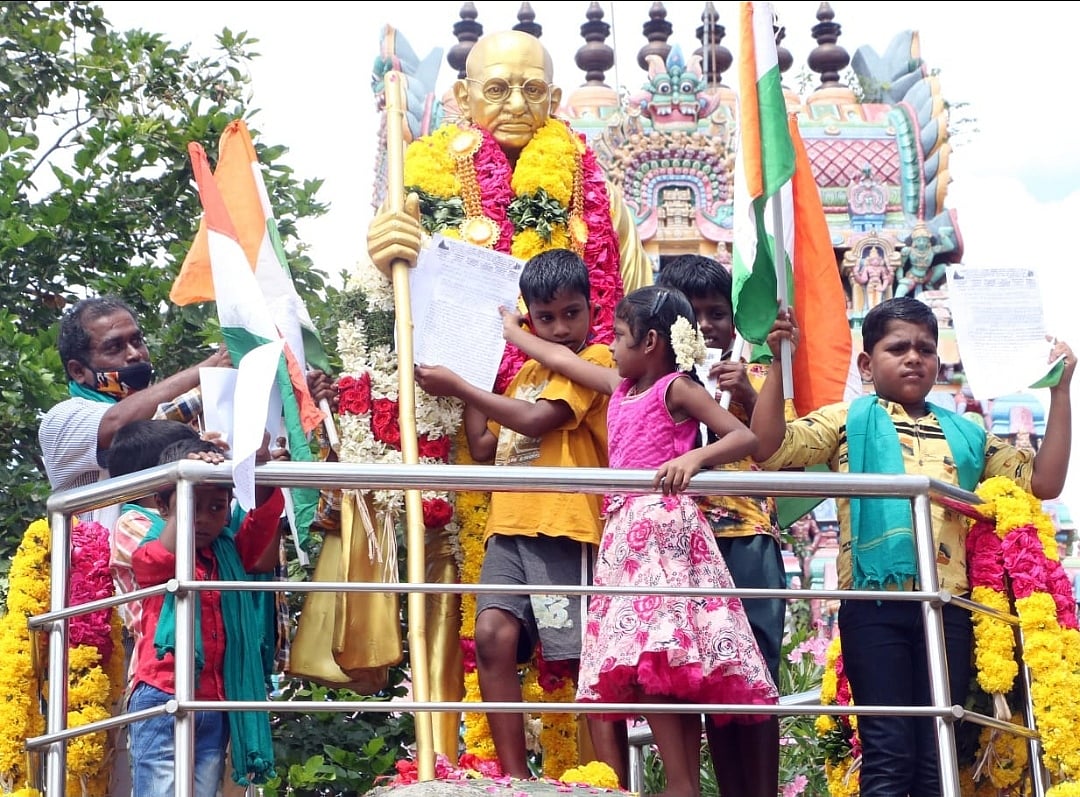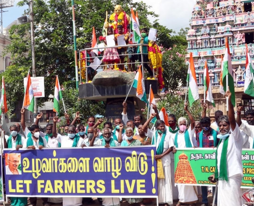 இந்நிலையில்தான் காந்தி ஜெயந்தியை முன்னிட்டு, தஞ்சை மாவட்ட காவிரி விவசாயிகள் பாதுகாப்புச் சங்கத்தைச் சேர்ந்த ஏராளமான விவசாயிகள் தங்களது குழந்தைகளோடு, கும்பகோணம் உச்சிப்பிள்ளையார் கோயில் பகுதியில் உள்ள காந்தி சிலைக்கு மாலை அணிவித்து மரியாதை செலுத்தினார்கள். அதைத் தொடர்ந்து மத்திய அரசு கொண்டு வந்துள்ள மூன்று வேளாண் சட்டங்களையும் ரத்து செய்யப் பரிந்துரை செய்யுமாறு, காந்தி சிலையிடம் மனு அளித்துவிட்டு தேசிய கொடியுடன் ஆர்ப்பாட்டம் நடத்தினார்கள். இச்சட்டங்களுக்கு எதிராகவும், டெல்லியில் போராடும் விவசாயிகளுக்கு ஆதரவு தெரிவித்தும் முழக்கங்களை எழுப்பினார்கள்.