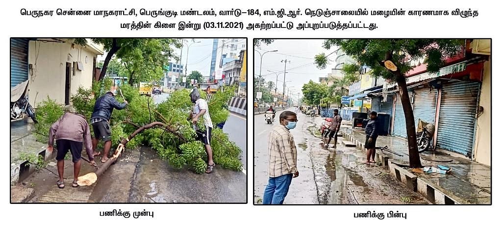 மேலும், ``கடந்த மூன்று மாதங்களாகப் போக்குவரத்துக்கு இடையூறாகவும், விழும் நிலையிலிருந்த சுமார் 19,025 மரக்கிளைகள் மாநகராட்சி பணியாளர்களால் அகற்றப்பட்டு அப்புறப்படுத்தப்பட்டுள்ளது. பொதுமக்கள் தங்கள் பகுதியில் போக்குவரத்துக்கு இடையூறாகவும், பாதுகாப்பற்ற விழும் நிலையில் உள்ள மரக்கிளை குறித்த தகவலை 1913 என்ற உதவி எண்ணுக்கும், 044-2561 9206, 2561 9207 மற்றும் 2561 9208 என்ற மாநகராட்சி கட்டுப்பட்டு அறை எண்ணில் தகவல் தெரிவிக்கலாம்" என்று கூறப்பட்டுள்ளது.