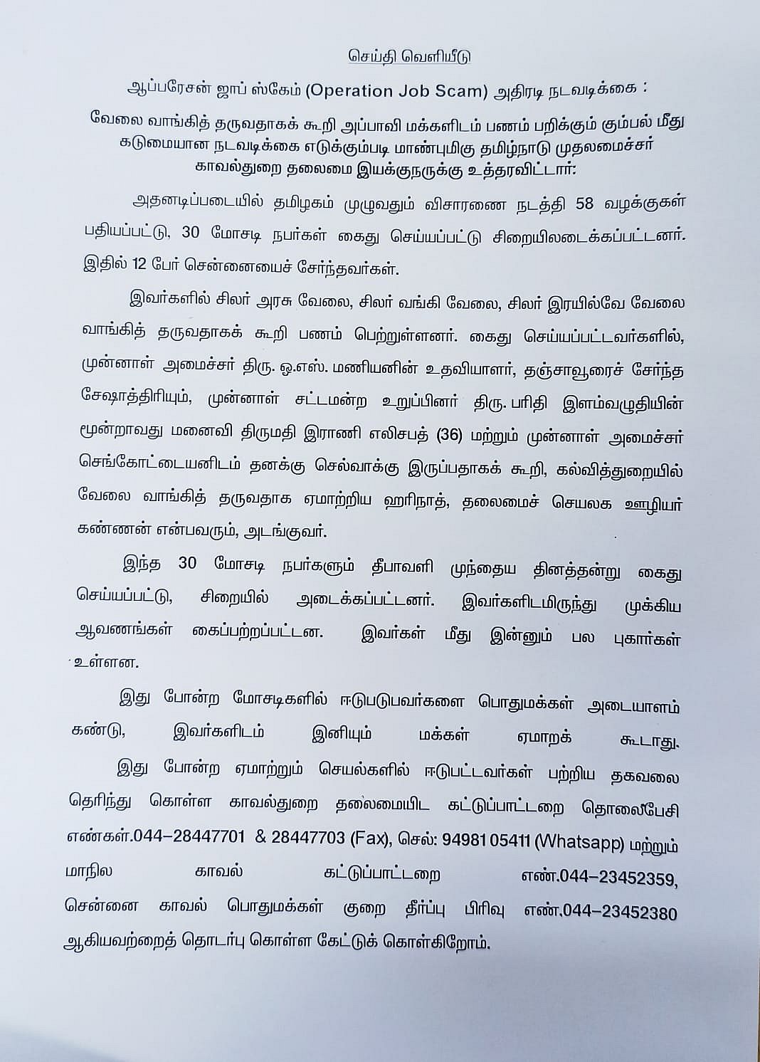 இதுகுறித்து டிஜிபி அலுவலகம் வெளியிட்டுள்ள செய்தி குறிப்பில் கூறியிருப்பதாவது, ``அரசு வேலை, வங்கி வேலை, ரயில்வே வேலை என ஆசை வார்த்தைகளைக் கூறி சிலர் பணத்தை வாங்கி மோசடி செய்திருக்கின்றனர். அதில் முன்னாள் அமைச்சர் ஓ.எஸ் மணியனிடம் உதவியாளராக இருந்த தஞ்சாவூரைச் சேர்ந்த சேஷாத்திரியும் முன்னாள் எம்.எல்.ஏ பரிதி இளம் வழுதியின் மூன்றாவது மனைவி ராணி எலிசபத் (36), முன்னாள் அமைச்சர் செங்கோட்டையனைத் தெரியும் எனக்கூறி கல்வித்துறையில் வேலை வாங்கித் தருவதாகக்கூறி ஏமாற்றிய ஹரிநாத், தலைமைச் செயலக ஊழியர் கண்ணன் ஆகியோர் கைது செய்யப்பட்டுள்ளனர். கைது செய்யப்பட்ட 30 பேர் மீதும் இன்னும் பல புகார்கள் உள்ளன.