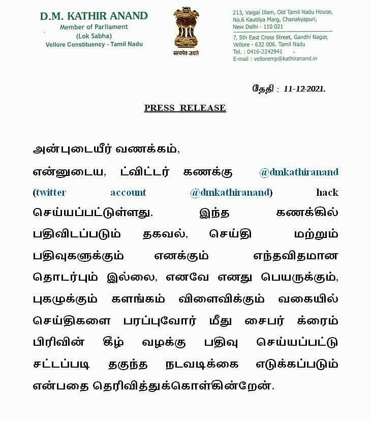 source https://www.vikatan.com/government-and-politics/politics/twitter-account-has-been-hacked-mp-kathir-anand-seeks-cyber-crime-help