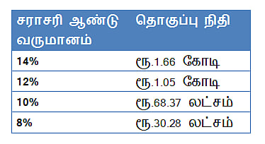 இதுவே டைவர்சிஃபைட் ஃபண்டுகள் ஆண்டுக்கு சராசரியாக 14 சதவிகிதம் வருமானம் கிடைத்திருந்தால் பணம் ரூ.1.66 கோடியாகப் பெருகி இருக்கும். இந்தப் பணத்தை ரிஸ்க் குறைவான ஹைபிரீட் ஃபண்டுகளில் முதலீடு செய்து, ஆண்டுக்கு சராசரியாக 10 சதவிகிதம் வருமானம் கிடைத்திருந்தால் இந்தத் தொகை ரூ.68.37 லட்சமாகப் பெருகி இருக்கும்.