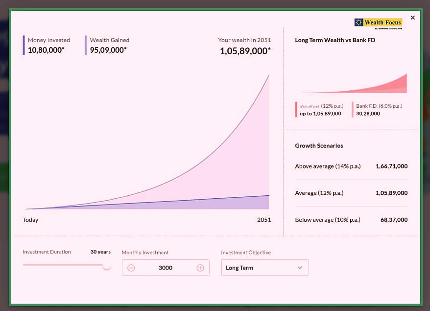 மாதம் ரூ.3,000 வீதம் தொடர்ந்து 30 ஆண்டுகளுக்கு ஒருவர் முதலீடு செய்து வரும்பட்சத்தில் மொத்தம் செய்திருக்கும் முதலீடு ரூ.10.80 லட்சமாக இருக்கும். இந்த டைவர்சிஃபைட் மியூச்சுவல் ஃபண்டுகள் மூலம் ஆண்டுக்கு சராசரியாக 12 சதவிகிதம் வருமானம் கிடைக்கும்பட்சத்தில் லாபம் மட்டும் ரூ. 95.09 லட்சம் கிடைத்திருக்கும். ஆக மொத்தம் ரூ.1.05 கோடி கிடைத்திருக்கும்.