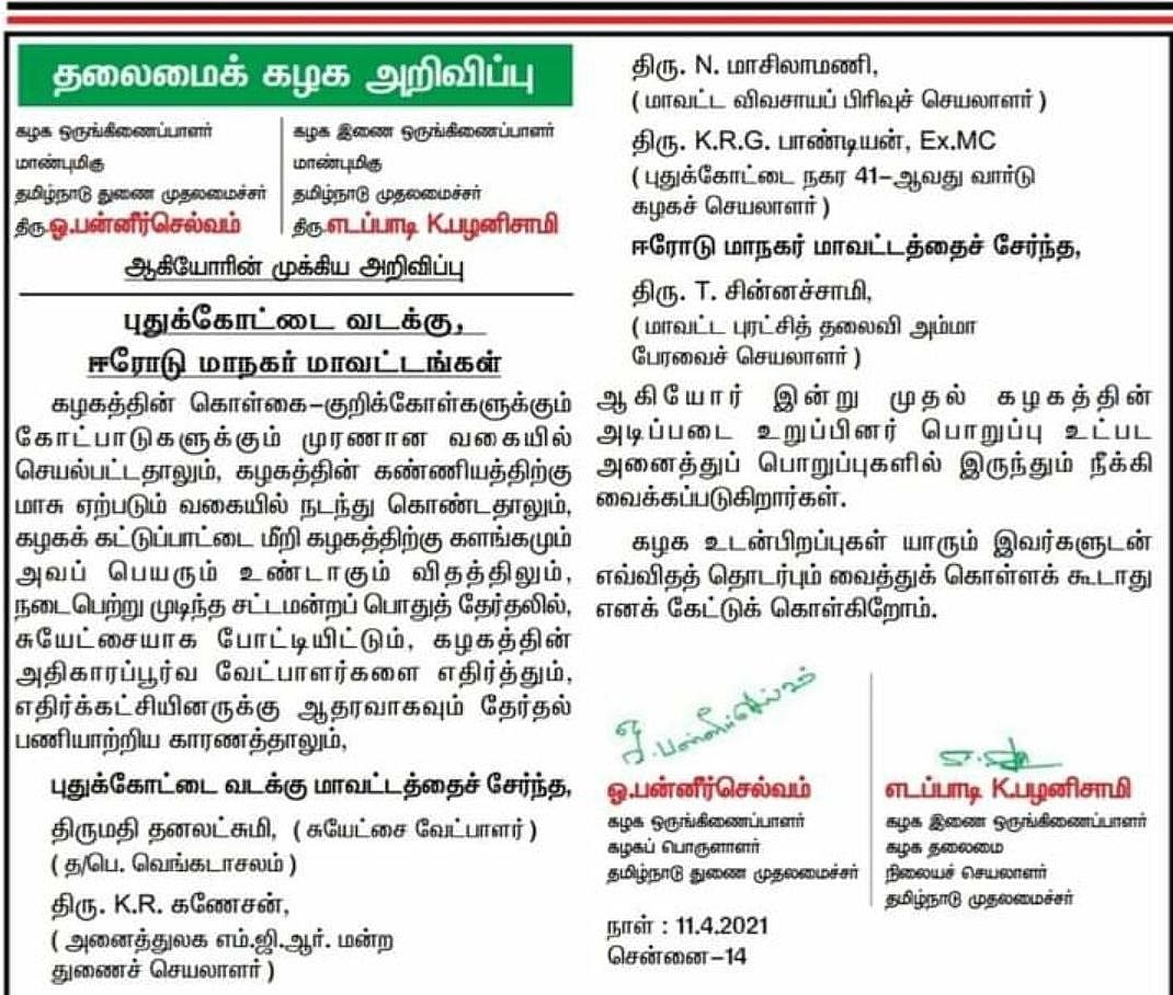 இந்த நிலையில் தான் கழகத்தின் கொள்கை-குறிக்கோள்களுக்கும் கோட்பாடுகளுக்கும் முரணான வகையில் செயல்பட்டதோடு, நடைபெற்று முடிந்த சட்டமன்றத் தேர்தலில் சுயேச்சையாகப் போட்டியிட்டதோடு, கழகத்தின் அதிகாரப்பூர்வ வேட்பாளர்களை எதிர்த்தும் எதிர்க்கட்சியினருக்கு ஆதரவாகவும் தேர்தல் பணியாற்றிய காரணத்தாலும் இன்று முதல் கழகத்தில் அடிப்படை உறுப்பினர் பொறுப்புகள் உட்பட அனைத்துப் பொறுப்புகளிலிருந்தும் இவர்களை நீக்குவதாகவும், இவர்களுடன் கழக உடன்பிறப்புகள் யாரும் எவ்வித தொடர்பும் வைத்துக் கொள்ளக்கூடாது என்று கழக ஒருங்கிணைப்பாளர் ஓ.பன்னீர்செல்வம், துணை ஒருங்கிணைப்பாளர் எடப்பாடி.கே.பழனிச்சாமி ஆகியோர் அறிவிப்பை வெளியிட்டிருக்கின்றனர்.