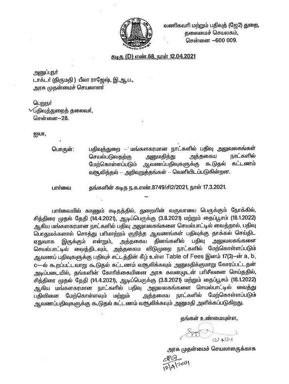 இதன் அடிப்படையில், சித்திரை முதல் தேதி (இன்று), ஆடிப்பெருக்கு (3.8.2021) மற்றும் தைப்பூசம் (18.1.2022) ஆகிய மங்களகரமான நாட்களில் பதிவினை மேற்கொள்ளும் மற்றும் அந்த நாட்களில் மேற்கொள்ளப்படும் ஆவண பதிவிற்கு கூடுதல் கட்டணம் வசூலிக்க அனுமதி வழங்கப்படுகிறது." என்று தெரிவிக்கப்பட்டுள்ளது.