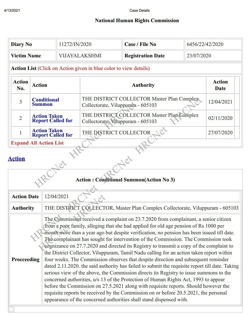 அப்போதும் பதில் கிடைக்காததால் கடந்த வருடம் தேசிய மனித உரிமைகள் ஆணையத்தில் புகார் அளித்துள்ளார் சா.விஜயலட்சுமி. இந்த புகாரை விசாரித்த மனித உரிமைகள் ஆணையம், இதற்கான உரிய ஆவணங்களுடன் பதில் மனுவை தாக்கல் செய்யும்படி விழுப்புரம் மாவட்ட ஆட்சியருக்கு உத்தரவிட்டு 27.07.2020 அன்று நோட்டீஸ் அனுப்பியிருந்தது. அதற்கு உரிய பதில் அளிக்கப்படாமல் போனதினால், பதில் மனுவை தாக்கல் செய்யும்படி மீண்டும் 02.11.2020 அன்று விழுப்புரம் மாவட்ட ஆட்சியருக்கு உத்தரவிட்டிருந்தது.