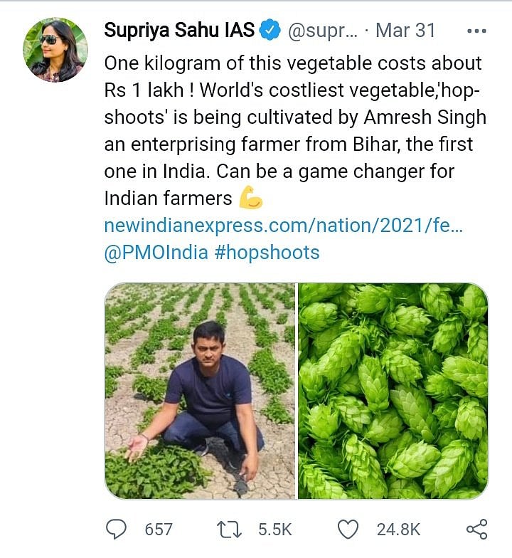 `உலகின் விலையுயர்ந்த காய்; ஒரு கிலோ ₹85,000..!' - அப்படி என்ன இதில் சிறப்பு?' என்கிற தலைப்புடன் கடந்த சில தினங்களுக்கு முன் விகடன் இணையதளத்தில் ஒரு செய்தி வெளியிடப்பட்டது. மார்ச் இறுதி மற்றும் ஏப்ரல் தொடக்கத்தில் இந்தியாவின் பல்வேறு ஊடகங்ளிலும் இந்தச் செய்தி வெளியாகியிருக்கிறது. பெரும்பாலும் ஐரோப்பிய நாடுகளில் விளைகிற ஹாப் ஷுட்ஸ் (hop-shoots) எனப்படும் தாவரத்தை, பீகாரைச் சேர்ந்த அம்ரேஷ் சிங் என்பவர் தன்னுடைய நிலத்தில் பயிரிட்டிருக்கிறார் என்பது தொடர்பான செய்திதான் அது.