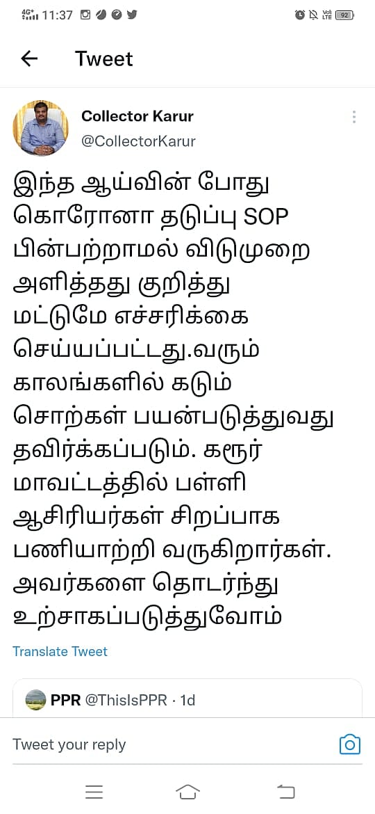 இரண்டு அதிகார மோதல்களுக்கு இடையே அப்பாவி ஆசிரியர்களை பலிகடா ஆக்கிவிட வேண்டாம்' என்று பதிவிட, விவகாரம் விறுவிறுப்பானது. இந்த நிலையில், மாவட்ட ஆட்சியர் மருத்துவர் பிரபுசங்கர், தனது ட்விட்டர் பக்கத்தில், 'இந்த ஆய்வின்போது கொரோனா விதிமுறைகளை பின்பற்றாமல் விடுமுறை அளித்தது குறித்து மட்டுமே எச்சரிக்கை செய்யப்பட்டது. வரும் காலங்களில் கடும் சொற்கள் பயன்படுத்துவது தவிர்க்கப்படும். கரூர் மாவட்டத்தில் பள்ளி ஆசிரியர்கள் சிறப்பாக பணியாற்றி வருகிறார்கள். அவர்களை தொடர்ந்து உற்சாகப்படுத்துவோம்' என்று தனது செயலுக்கு மன்னிப்பு கோரும்விதமாக பதிவிட, அதன்பிறகே விவகாரம் முடிவுக்கு வந்திருக்கிறது.