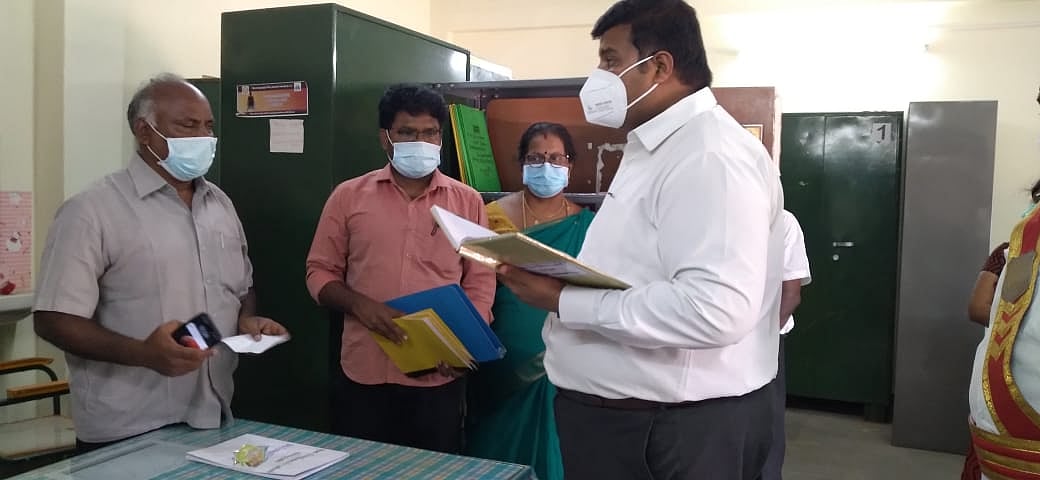 கரூர் மாவட்டம், வெள்ளியணை அருகே உள்ள பொரணியில் அரசு மேல் நிலைப்பள்ளி ஒன்று செயல்பட்டு வருகிறது. இந்த நிலையில், இந்தப் பள்ளியில் பணிபுரியும் ஆசிரியை ஒருவருக்கு கொரோனா தொற்று உறுதி செய்யப்பட்டது. இதையடுத்து, அவர் மருத்துவர்களின் ஆலோசனைபடி வீட்டில் தனிமைப்படுத்தி கொண்டார். இதையடுத்து, மாவட்ட நிர்வாகத்தின் ஏற்பாட்டில், சுகாதாரத்துறையினர் அந்த பள்ளிக்கு சென்று மற்ற ஆசிரியர்களிடம் கொரோனா பரிசோதனை மேற்கொண்டனர். இந்த நிலையில், கரூர் மாவட்ட ஆட்சியர் மருத்துவர் பிரபுசங்கர், பொரணி அரசு மேல்நிலை பள்ளிக்கு கடந்த செவ்வாய் அன்று ஆய்வு மேற்கொண்டார். அப்போது, பள்ளிக்கு மாணவர்கள் யாரும் வரவில்லை. இதுகுறித்து, தலைமை ஆசிரியர் (பொறுப்பு) சண்முகசுந்தரத்திடம் கலெக்டர் கேட்டபோது, அவர் பள்ளிக்கு விடுமுறை அளிக்கப்பட்டு இருப்பதாக கூறினார். இதனால், கோபமான ஆட்சியர், 'இது என்ன உங்க அப்பன் வீட்டு சொத்தா?. ஒன்றரை வருடமா வீட்டில் இருந்தீங்க. இப்போது பள்ளிக்கு வருவதற்கு என்ன?' என்கிற ரீதியில் பேசியதாக சொல்லப்படுகிறது.